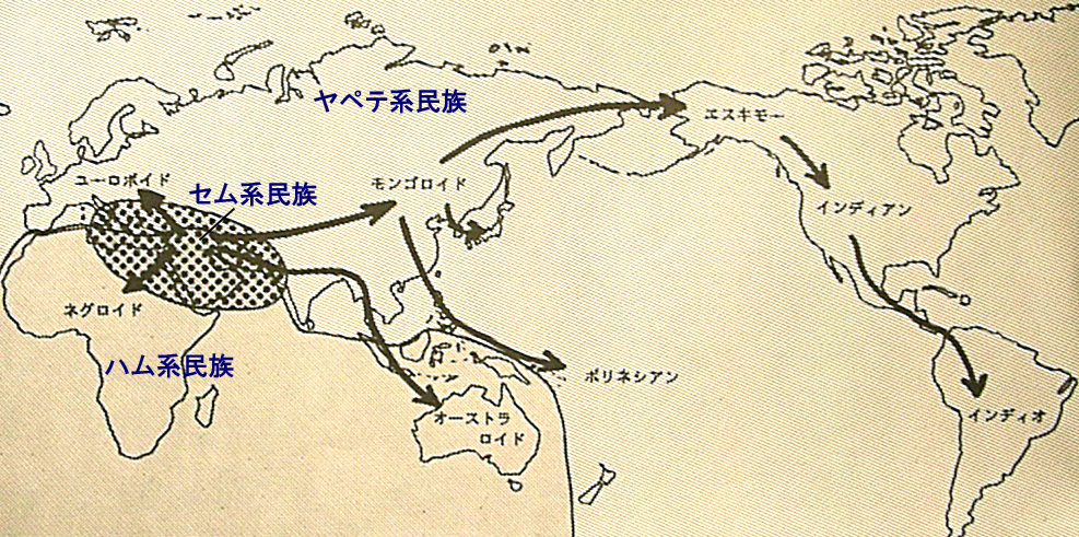 もしモンゴロイドがヤペテ系だとすれば、日本人は基本的にヤペテ系、ということになります。「ヤペテ」系民族は、「広い」を意味するその名が示す通り、世界の非常に広い範囲に移り住んだのです。